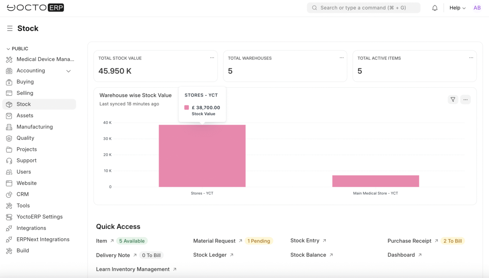 Consider a mid-size medical device company managing thousands of units of diagnostic devices across multiple warehouses. Before YoctoERP, stock discrepancies and missing inspection certificates delayed shipments, increased audits, and caused customer dissatisfaction. With YoctoERP: